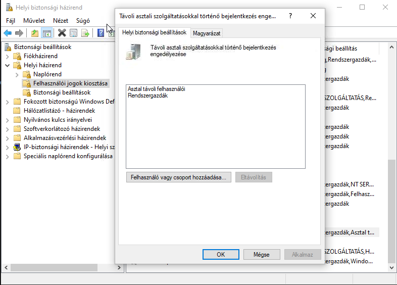 Üsse le a Windows + R billentyűkombinációt és írja be a secpol.msc parancsot. A Biztonsági beállítások\Helyi házirend\Felhasználói jogok kiosztása menüben a Távoli asztali szolgáltatásokkal történő bejelentkezés pontban csak azokat a felhasználókat tartsa meg, akiknek engedélyezni szeretné a távoli elérést. A többit törölje ki, különösen az adminisztrátori jogosultságú felhasználókat és csoportokat.