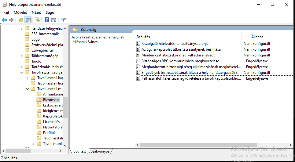 Számítógép konfigurációja\Felügyeleti sablonok\Windows összetevők\Távoli asztali szolgáltatások\Távoli asztali munkamenetgazda\Biztonság