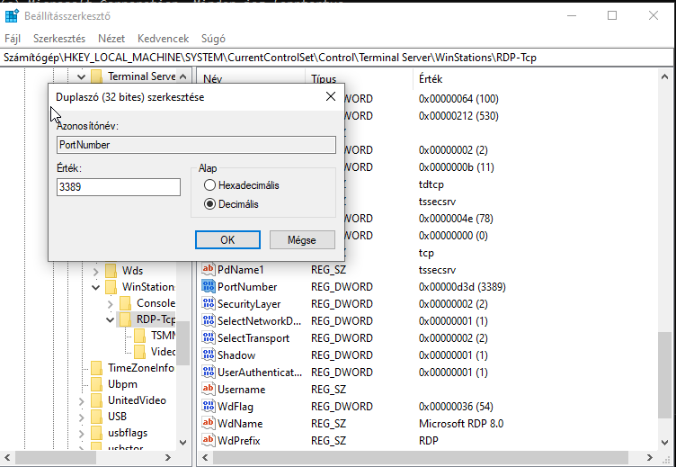 A regedit baloldali fa struktúrájában keresse ki a következő bejegyzést: Számítógép\HKEY_LOCAL_MACHINE\SYSTEM\CurrentControlSet\Control\Terminal Server\WinStations\RDP-Tcp A jobb oldalon keresse meg a PortNumber értéket és nyissa meg. A megjelenő ablakban állítsa át decimálisra a megjelenítést, és állítson be egy 10000 és 65000 közötti számot. A későbbiekben a csatlakozáshoz ez a portszámot kell használnia.