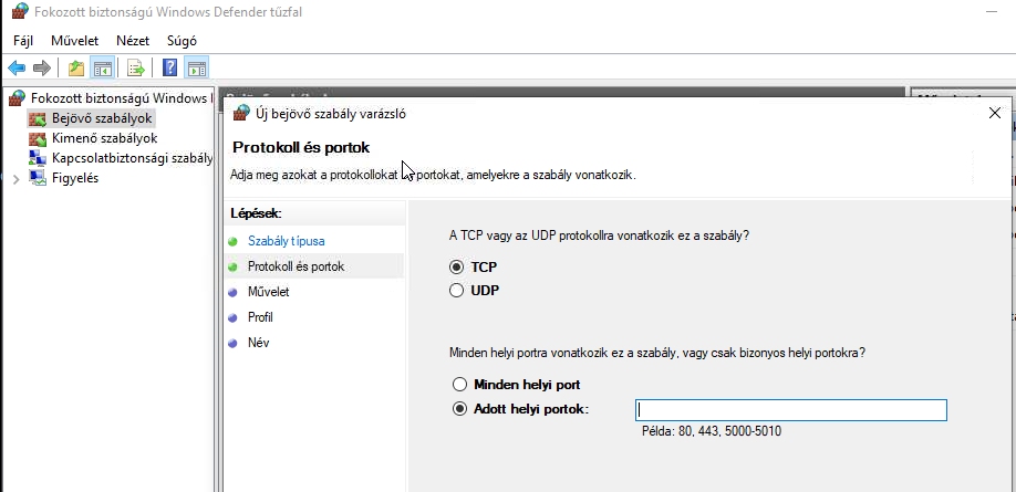 A tűzfalon engedélyezni kell az előző pontban megadott új kapcsolódási portot. Amennyiben külső gyártó tűzfala van telepítve a gépre, az alkalmazás dokumentációjában nézzen utána a bejövő kapcsolatok engedélyezésének.