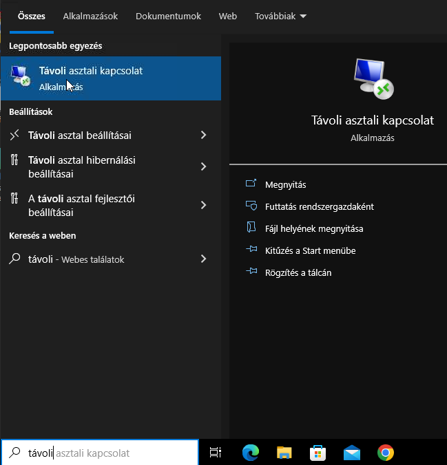 Kattintson a start gombra és kezdje el begépelni a távoli asztal szöveget. A felkínált lehetőségek közül válassza ki a Távoli asztal kapcsolat alkalmazást.