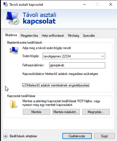 A felhasználónév mezőben adja meg a távoli gépen beállított felhasználónevét és pipálja ki a Hitelesítő adatok mentésének engedélyezése opciót.