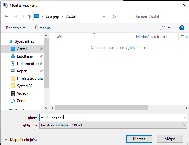 A beállított kapcsolatot elmentheti és a későbbiekben a kapcsolat ikonján keresztül is elérheti. Ehhez kattintson a Mentés másként... feliratú gombra, válassza ki a mentés helyét (például Asztal) és adja meg a kapcsolat nevét.